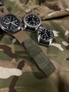 24mm black webbing base with hook and loop closure. Available in 18, 20 and 22mm lug.