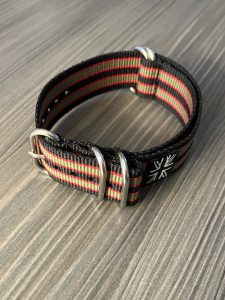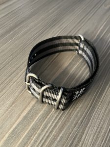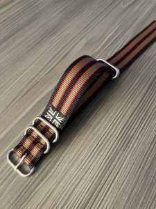 22mm Regimental style NATO with polished 5 ring hardware and will fit wrist size 6 – 7.75 inches