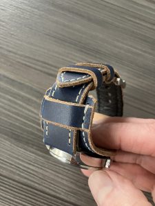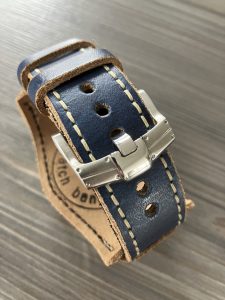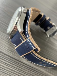 Dark blue matt calf leather lined in a soft black calf  3.5 – 4mm thick. Has raw slightly bevelled edges and comes with 2 keepers, 1 sewn in and 1 running. Natural colour heavy contrasting stitch. This makes for a rugged looking casual “jeans day “strap.